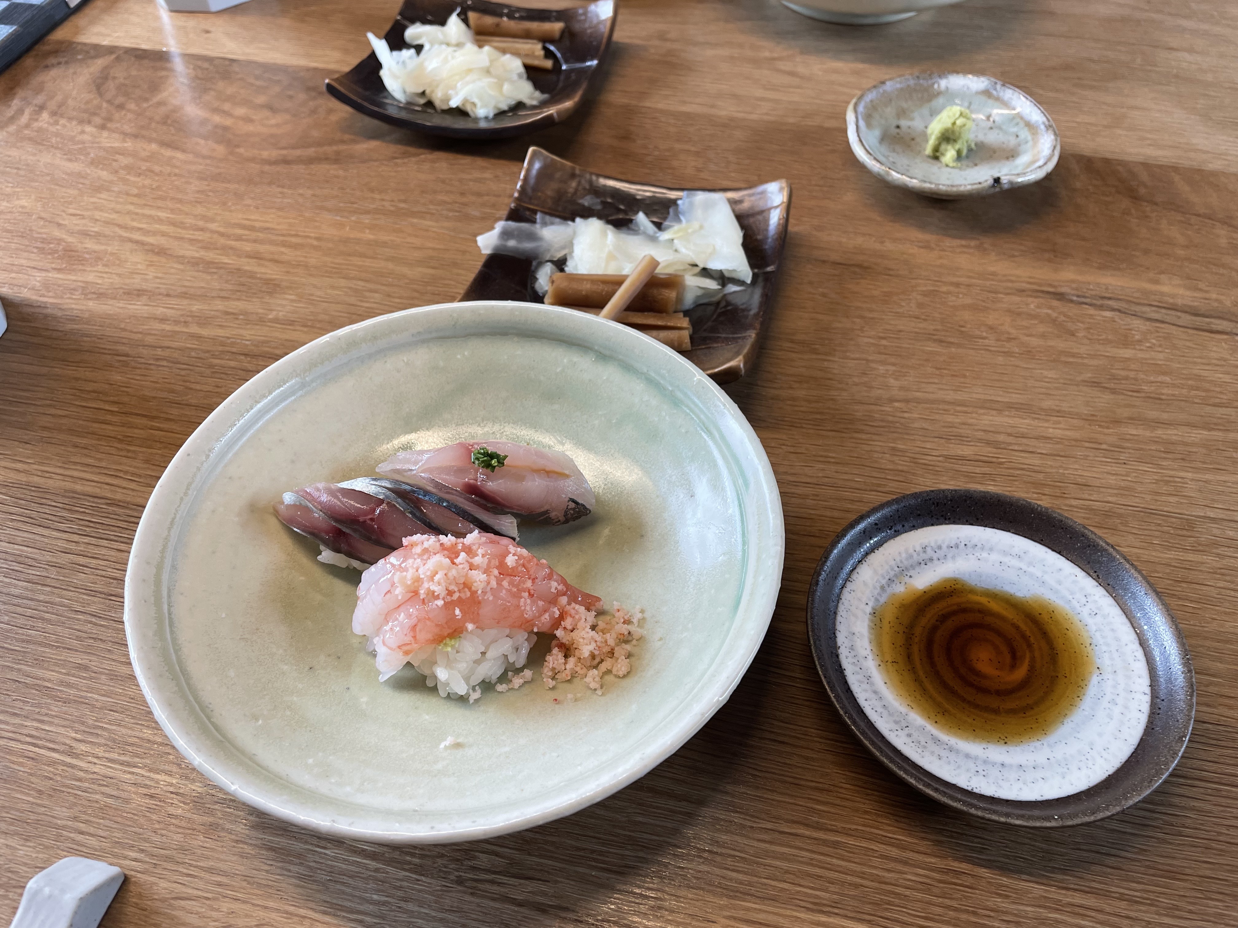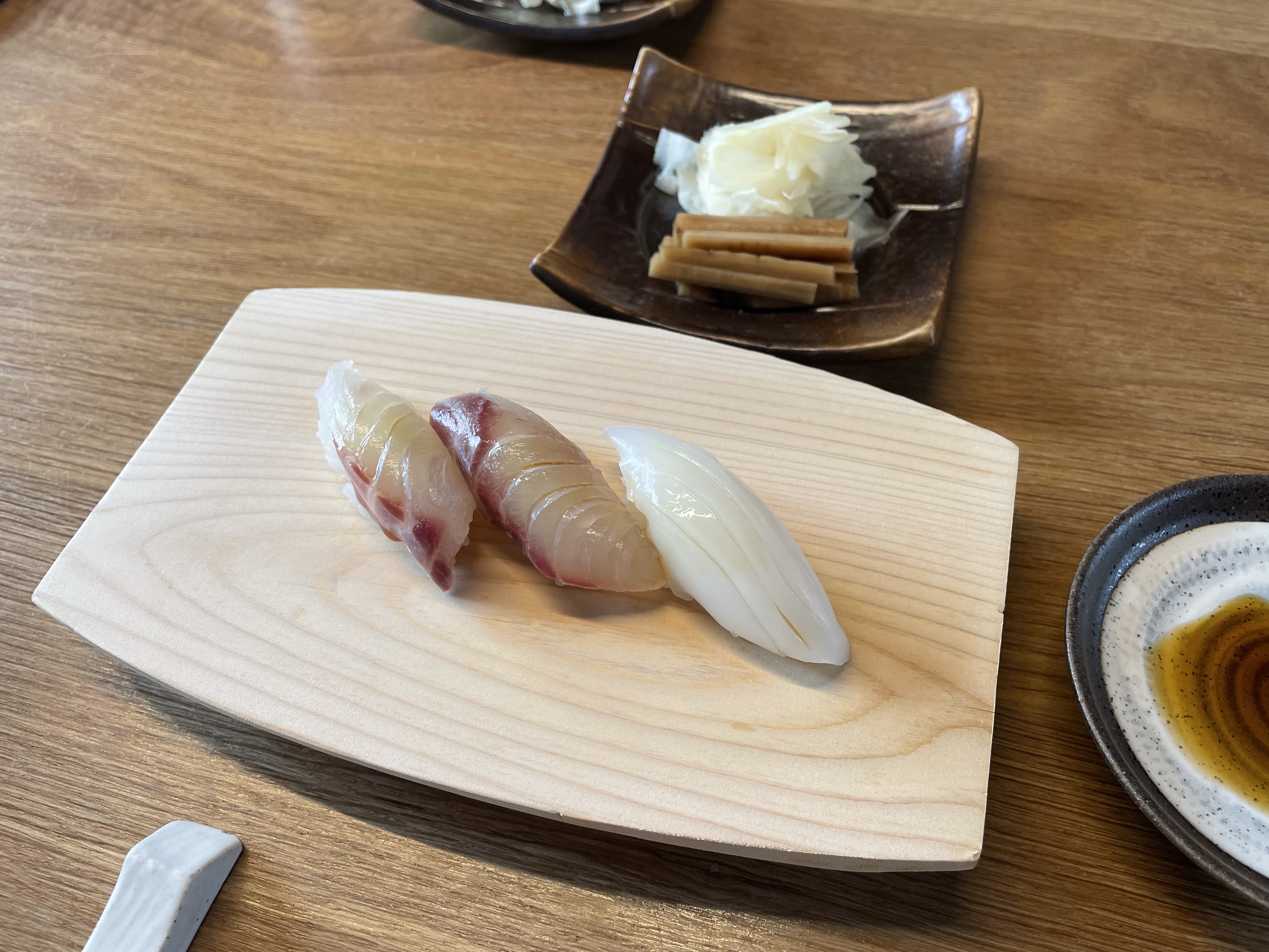 첫 접시는 왼쪽부터 순서대로 참돔, 감성돔, 무늬오징어. 방문 전에 여러 포스팅에서 공부를 많이 하고 갔는데, 첫 접시에 광어를 내어주시는 경우도 많이 봤는데 이번엔 광어는 없었다. 세 피스 모두 맛은 당연히 좋았고, 무늬 오징어가 쫄깃하고 고소한 게 맛있었다. 샤리 (밥)은 조금 간간하고 꼬들해서 밥알이 하나하나 살아있는 느낌!
