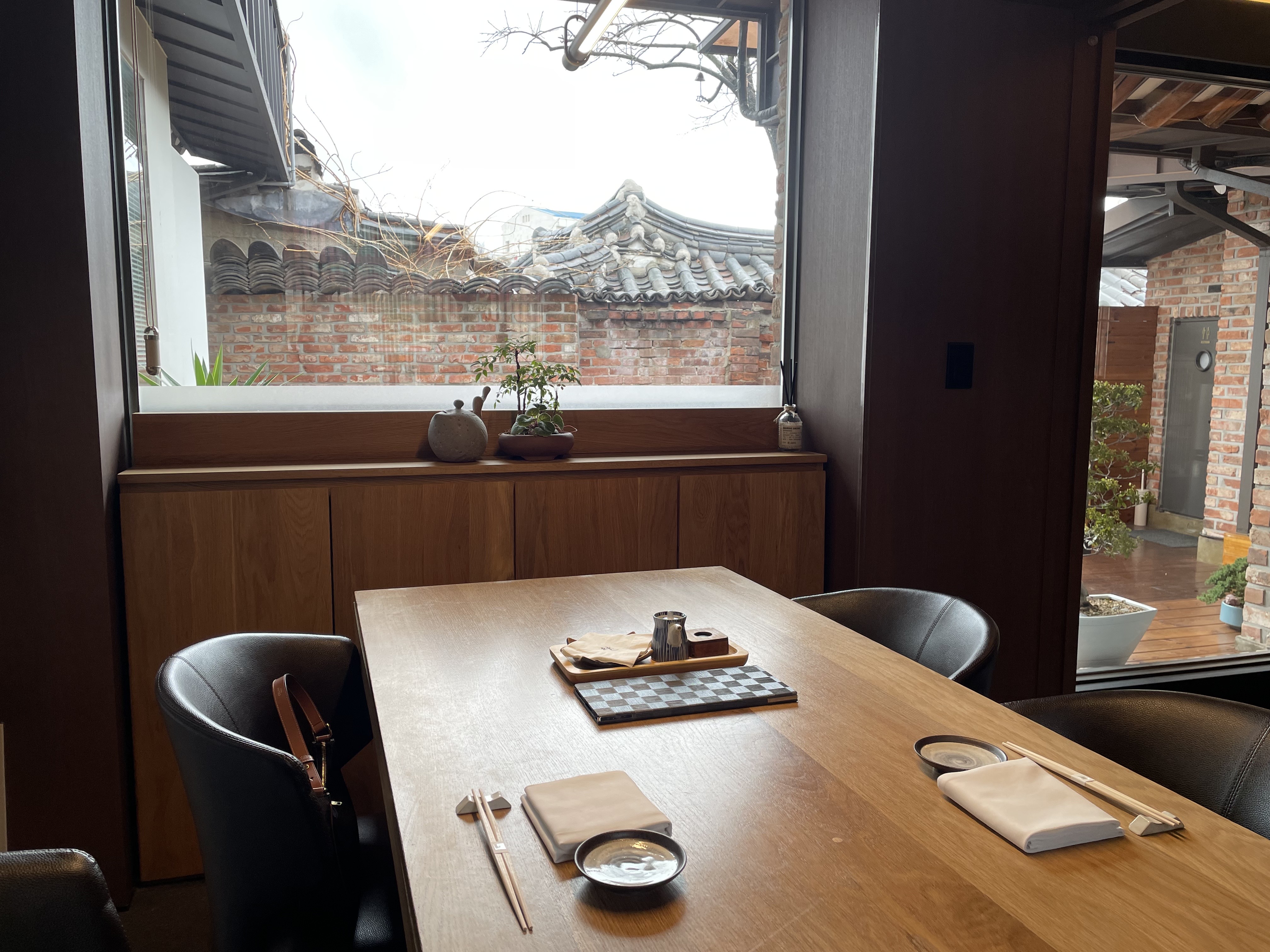 아름다운 키즈나의 외관답게, 내부의 인테리어도 너무 훌륭하고 멋졌다. 한옥을 리모델링했지만 일본 풍도 조금씩 섞여있는 듯한 그런 인테리어. 참 조용하고 차분한 것이 부슬비 내리는 그날에 딱 어울렸다. 식사 중에는 저기 보이는 한옥 지붕 위로 고양이가 왔다 갔다 했다.