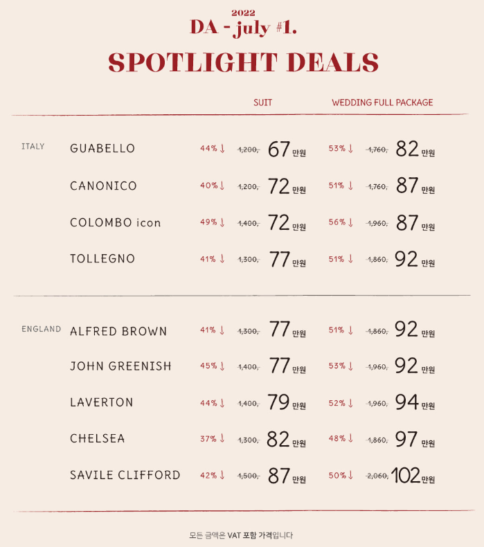 이태리 까노니코 원단 웨딩풀패키지B + 비스포크 제작: 87만원 + 35만원 = 122만원